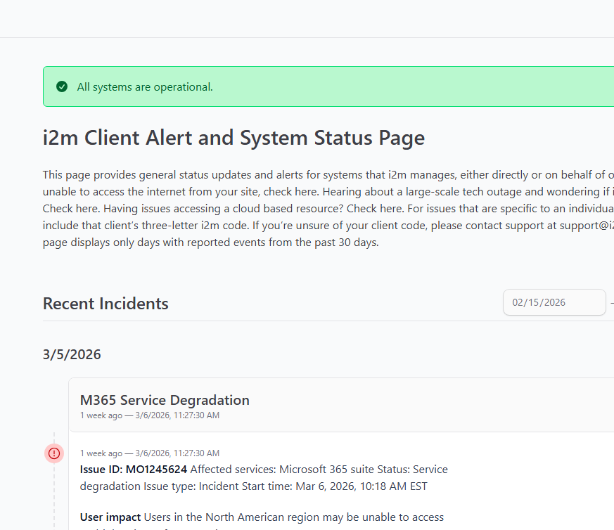Recently i2m launched a System Status site where you can quickly check the status of services you rely on, including Microsoft 365, AWS and Azure.